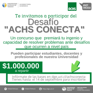 Hasta el lunes 14 de septiembre a las 23.59 estarán abiertas las postulaciones a este desafío en la página https://dge.uct.cl/achsconecta/, donde pueden formarse equipos de estudiantes junto a docentes o profesionales de la Universidad. El 21 de septiembre será el comienzo de este bootcamp con los equipos inscritos, el que finalizará el 25 de septiembre con la premiación del primer, segundo y tercer lugar, los que recibirán premios de $500.000, $350.000 y $150.000, respectivamente.
