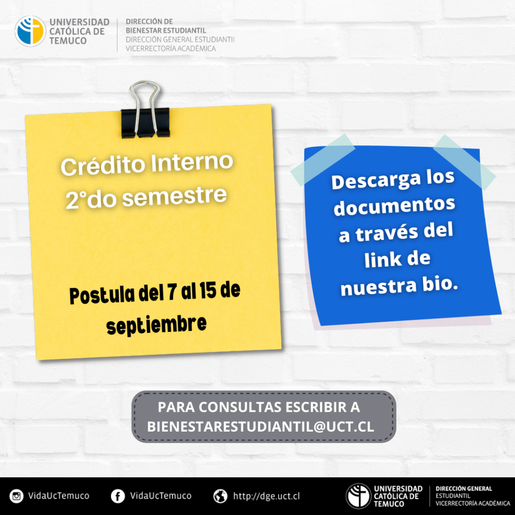 Desde el 07 de septiembre hasta el viernes 15 de septiembre a las 13:00 horas, se encontrará habilitado el proceso de postulación a Crédito Interno de la UCTemuco, al que […]