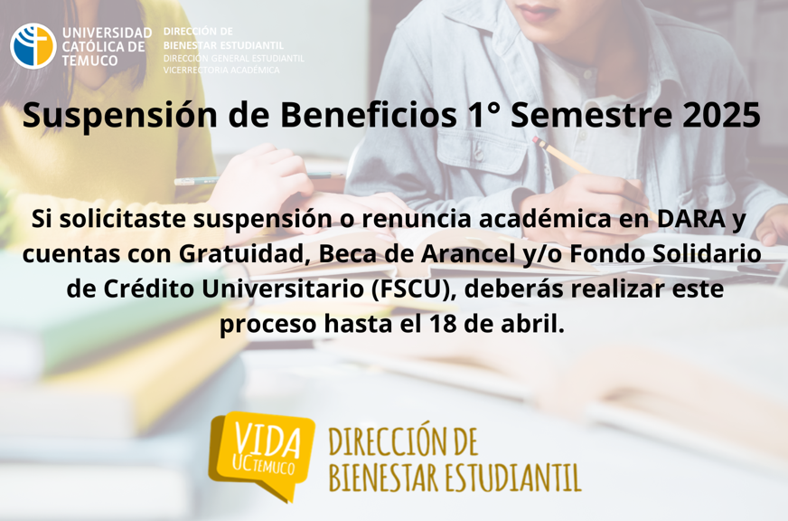Estimadas y estimados estudiantes: Les informamos que el proceso para solicitud de suspensión de Beneficios Estudiantiles correspondiente al primer semestre 2025, se encuentra habilitado hasta el día viernes 18 de abril a través del portal del estudiante. Este proceso debe ser ejecutado […]
