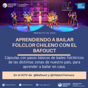 Así nace el proyecto Aprendiendo a bailar Folclor Chileno con el Ballet Folclórico de la UC Temuco, BAFOUCT.  Amantes de la danza, la cultura de nuestro país y enmarcados en la emergencia sanitaria actual, compartieron a la comunidad cápsulas de video enseñando pasos básicos de las danzas tradicionales de las diversas zonas de nuestro país, con el objetivo de dar valor a la cultura y un espacio de recreación ante la situación actual.